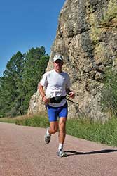 Eric Clifton led for quite a bit of the race, so I have to admit I was more than a tad surprised when I came up behind him around mile 62, going up the big climb to the Crazy Horse monument. He was running very, very slow. Frankly, I wasn't sure what the etiquette was to pass someone like him. I thought about Dietzing him. This is what Randy did to Steve Pero at MMT last year - you just blow by the person and yell "Hey" as loud as you can. I had previously seen this maneuver by Russ Evans at MMT as well but without the audio effect. Although I'm sure Randy and Russ would have done that, I just couldn't. Besides, I wanted to talk. So, he and I ran together for a while and talked. I must admit that I have watched Running on the Sun about seven times (Eric won Badwater that year), and over the past several years I have tried to pattern my running stride after Eric. I'm surprised more of you haven't noticed (truth be known, I don't think anybody has noticed). Anyway, I started to run ahead, and he said, "Don't let me hold you back." He dropped two miles later.