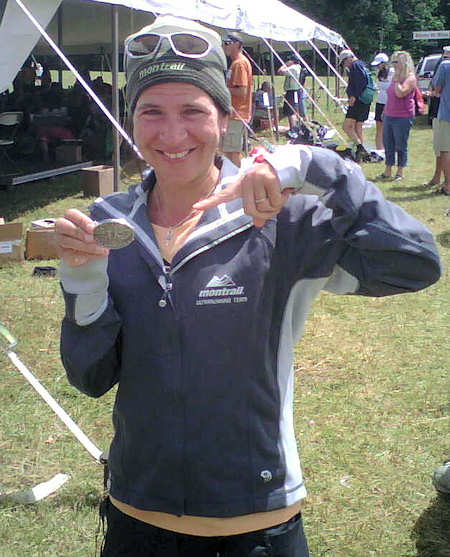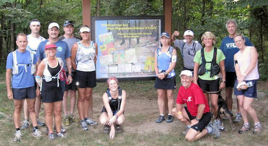 Dahlgren Heritage Rail Trail 50 km: Karsten Brown was second at the Dahlgren Heritage Rail Trail 50 km held east of Fredericksburg on August 8. Results | Event Web site Catoctin: The annual run that people love to hate, the Catoctin 50km, was held on August 1. VHTRC member, Michele Harmon, was the winning female. Here is a report from Dave Garmin: Official results are not going to be posted until Kevin Sayers gets back from Bike Week in South Dakota. Notable VHTRC performances: Michele Harmon won the women's division. Karsten Brown was 2nd overall. Kevin Sayer's pre-race brief was unceremoniously interrupted with a air-horn fanfare and court jesters heralding Kevin's 10th year as RD. He was honored with some appropriately golden locks - a foot-long, clip-on pony tail on a Hells Angel-style bandana to provide him instant biker cred in Rapid City. Bradley Mongold (Martinsburg, WV) crossed in 4 hours, 50 minutes, 45 seconds - in defiance of Kevin's emphatic prediction "No one here will run sub-5 today." Kevin credits the unexpectedly mild weather (it didn't quite hit 90 degrees) for this year's uncharacteristically fine times. Kevin will no doubt spend the next 11 months sharpening rocks, felling blowdowns and importing mud to ensure such an outrage is not repeated. Photos by Jim Treece | Event Web site Catherine's Furnace: Karsten Brown and Justine Morrison won the Catherine's Furnace Fat Ass 50km. Karsten had a great run. He even beat some very good runners who ran a shorter course because the trail out to the overlook was not marked and several missed it. It was a great day in the mountains with wonderful weather and camaraderie. A big thanks to RD Jeff Reed, his two lieutenants Tom Corris (on grill) and Linda Wack (volunteer coordinator), and the many other volunteers. Photos on Flickr from: Bobby Gill (includes video of Sophie) | Quatro | Anstr | Charlie Miracle (includes Doll's Eyes) | Video of Start | Event Web site ![]() Brian Schmidt after the VT 100 Photo: Steve Core Vermont 100: Brian Schmidt and Annette Bednosky lead several VHTRC finishers at the Vermont 100 held on July 18-19. Brian was fifth over all in 18:14, while Annette finished her 66th ultra as fourth woman and first senior woman. Results | Vermont Web site ![]() The Happy Couple at Hardrock Michele (left) and Joe VHTRC.org News Exclusive: Our crack news team opened it's e-mail from Joe Clapper: VHTRC President Emeritus Joe Clapper and medical marvel Dr. Michele Harmon would like to announce their engagement (to each other). ![]() Alisa Springman (center) with her crew at Badwater which is the start of the Badwater run. Photo: Bobby Gill (many more on Flickr) Alisa Finishes Badwater: Alisa Springman finished Badwater, the 135 mile run from Death Valley to the base of Mt. Whitney in California. Several VHTRC members, including Alisa, have done Badwater over the years. It was about 120° F in Death Valley yesterday. Here are pictures of Alisa and her crew finishing. (Click the right-pointing arrow and you will see more pictures.) For far more pictures, see those from Bobby Gill who was on Alisa's crew. Badwater Webcast. Browntown Loop: Almost 30 people participated in the annual Browntown loop run held on July Fourth. A good time was had by all, we gather. John Nelson sent the photo at right, but we were derelict in gettting it posted.